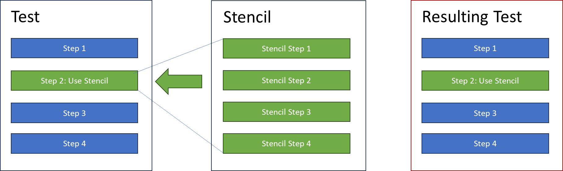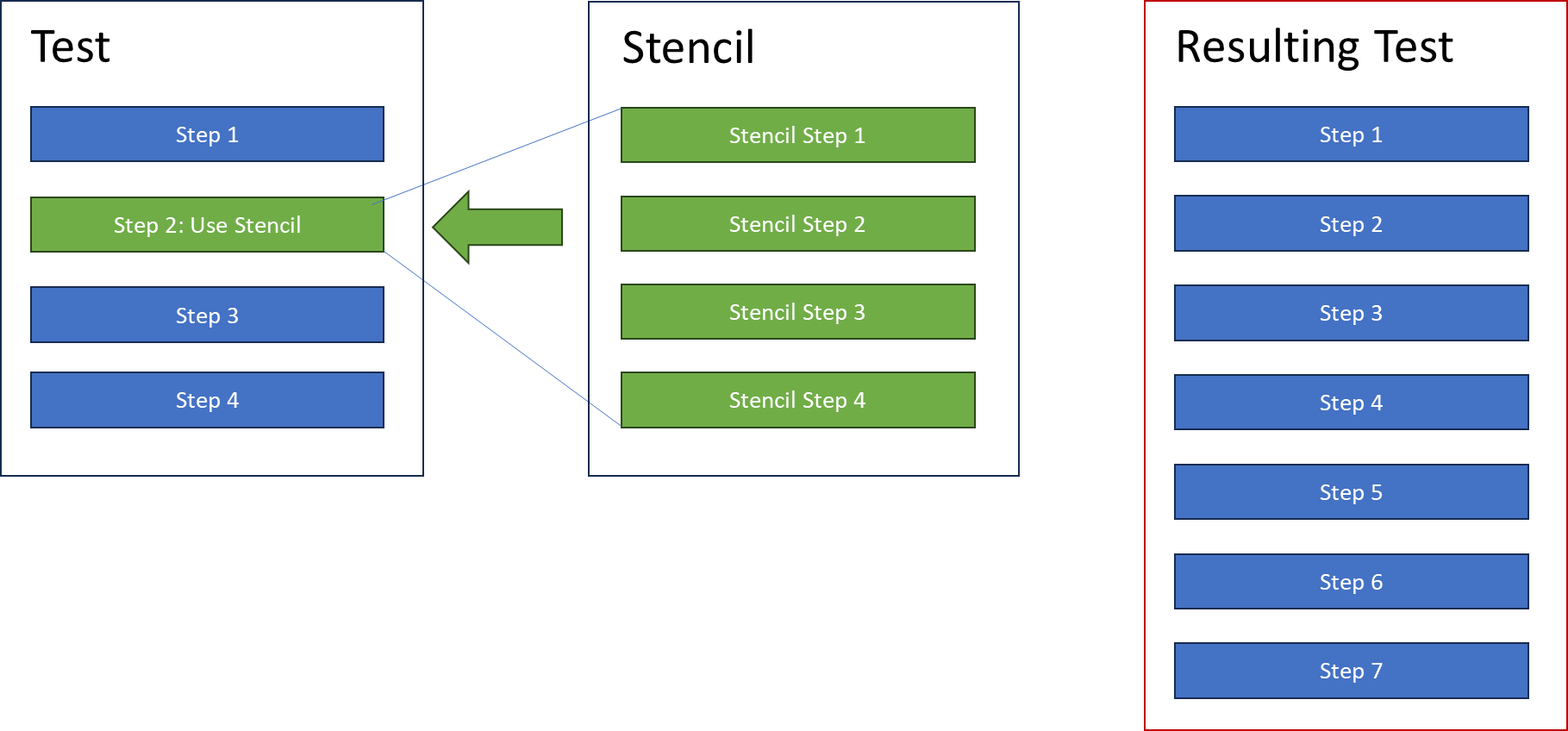If you select 'Use Stencil' in a test's step flow, the steps of the selected stencil will be used at this position in the step flow, as if they had been created at this position one by one. They are not copied as such but will be used during the test run.